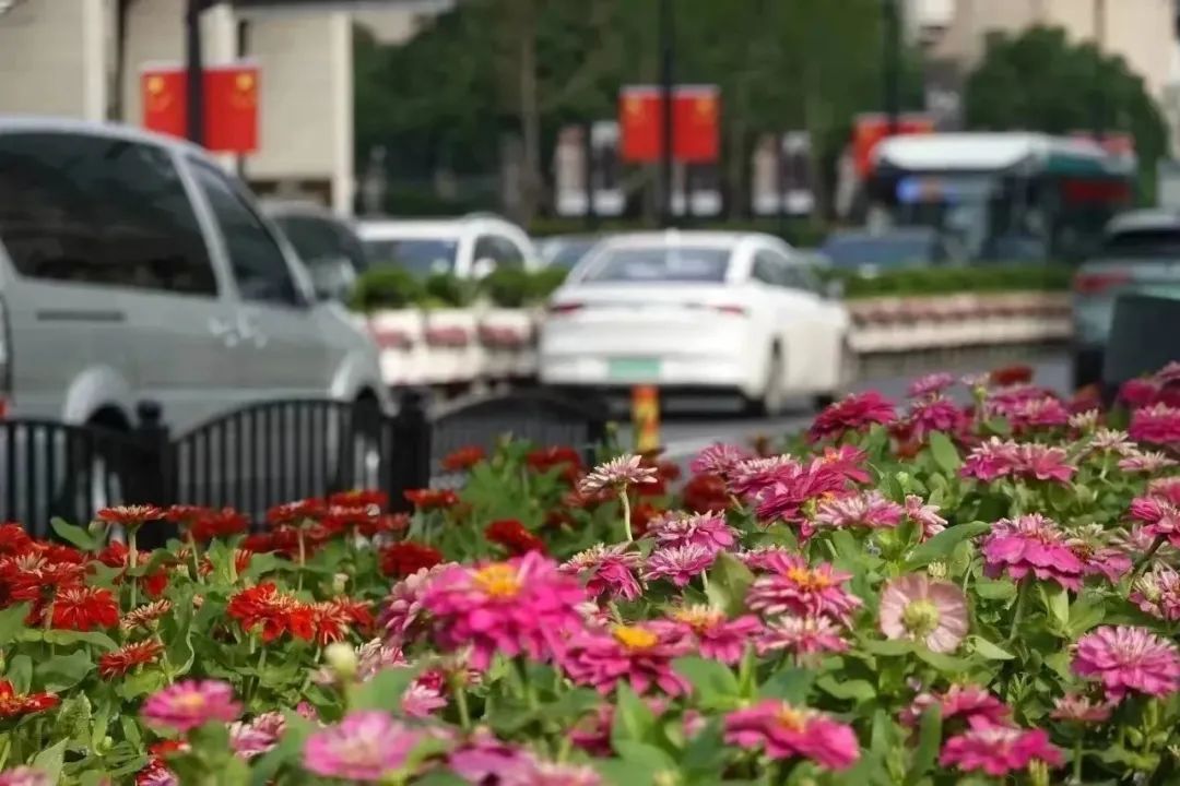 绿地景观中,选用了秋色植物和大面积的籽播花卉为主,搭配醉蝶花、一串红、百日草等景观花卉,营造出高低错落、色彩丰富的景象。这些景观花坛在点上增丽、线上添秀、面上多彩,共同营造出属于徐汇的节日“高定景观”。