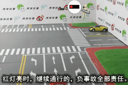 图中红车直行闯红灯撞了黄车,所以红车负全责。