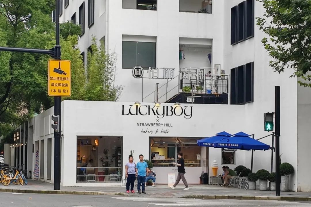 沿着宋园路向南走过宋庆龄陵园和上海儿童博物馆,在与黄金城道的丁字路口停下,LUCKYBOY×STRAWBERRY HILL(草莓山)的招牌迎面映入眼帘。