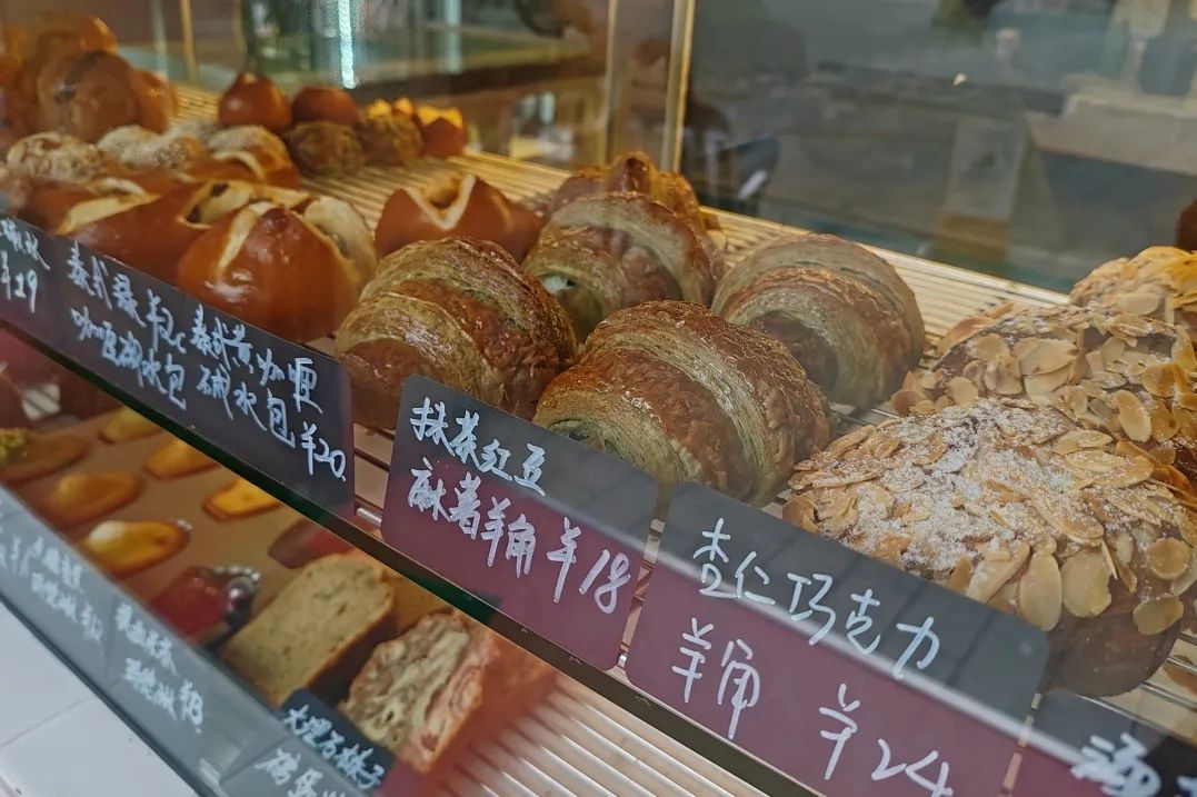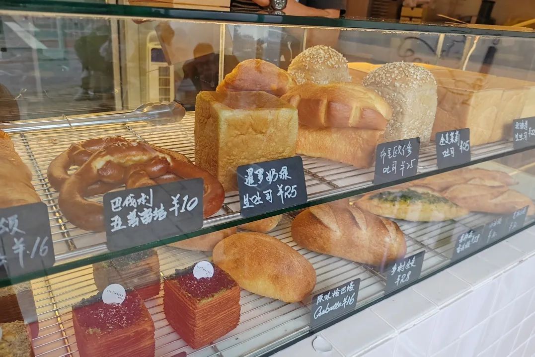 提拉米苏、抹茶红豆麻薯羊角、蝴蝶酥、枫糖吐司、恰巴塔......橱窗里的品类囊括面包、甜点和点心各类,每种食物都用黑色的卡片明码标价。