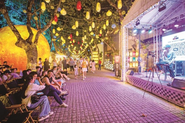 “平日的人流量在3.5万—4万人次,周末可以突破5万人次。”九里仓集团总裁李南伦介绍,作为无锡新近形成的文化艺术聚集地,九里仓街区持续打造丰富多样的高品质演出,不仅有灯光舞美俱佳的品牌舞台演出,还有奇幻绚丽的水幕光影大秀,无论是新来乍到还是老客常来,都能感受到有趣、有料。