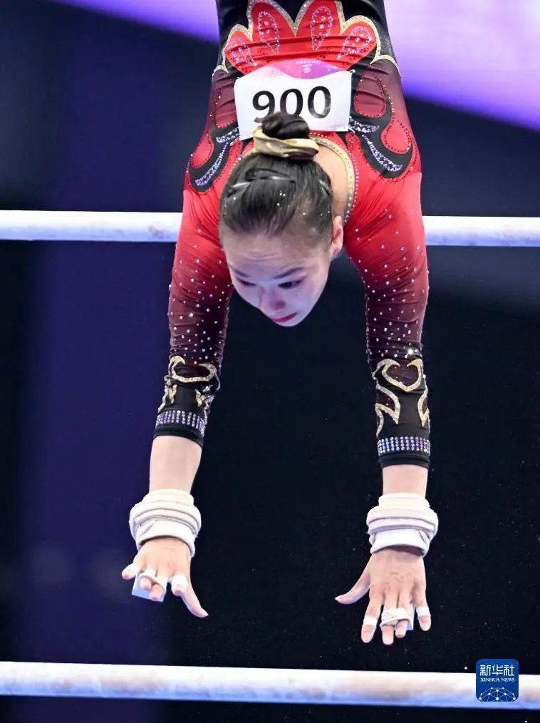 中国队选手章瑾在高低杠项目中