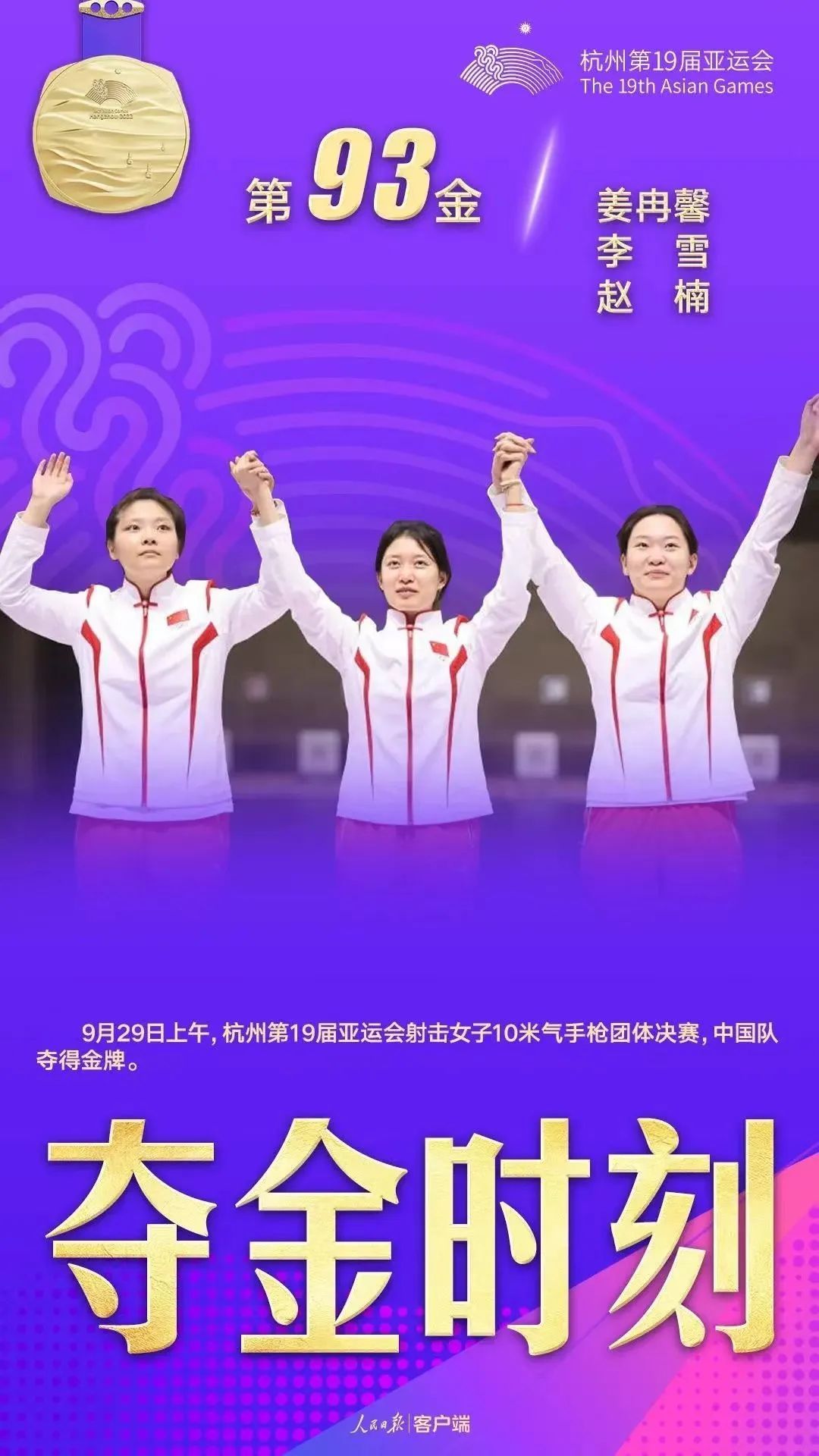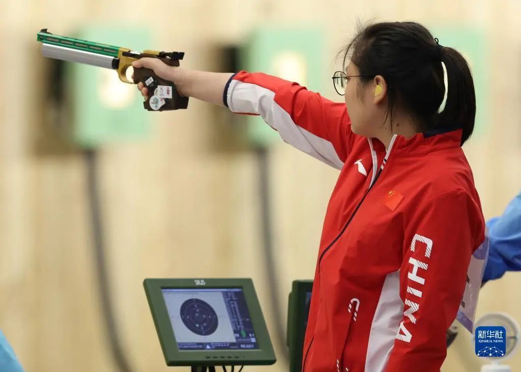 9月29日,在杭州亚运会女子10米气手枪团体赛中,上体学子姜冉馨和队友李雪、赵楠组成的中国队以总环1736环的成绩破赛会纪录,获得冠军。