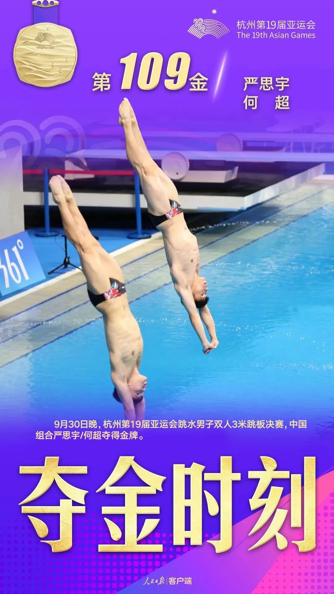 9月30日,在杭州亚运会跳水项目男子双人3米跳板决赛中,上体学子严思宇和队友何超以422.55分获得冠军。