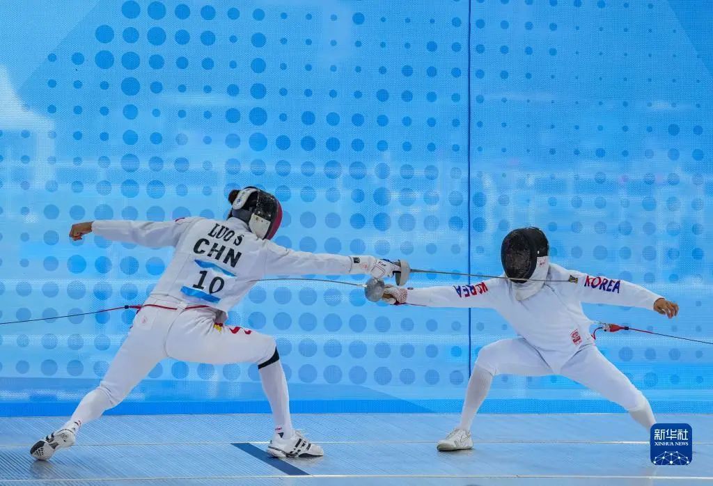 中国队选手罗帅(左)和韩国队选手全雄泰在男子个人击剑擂台赛中