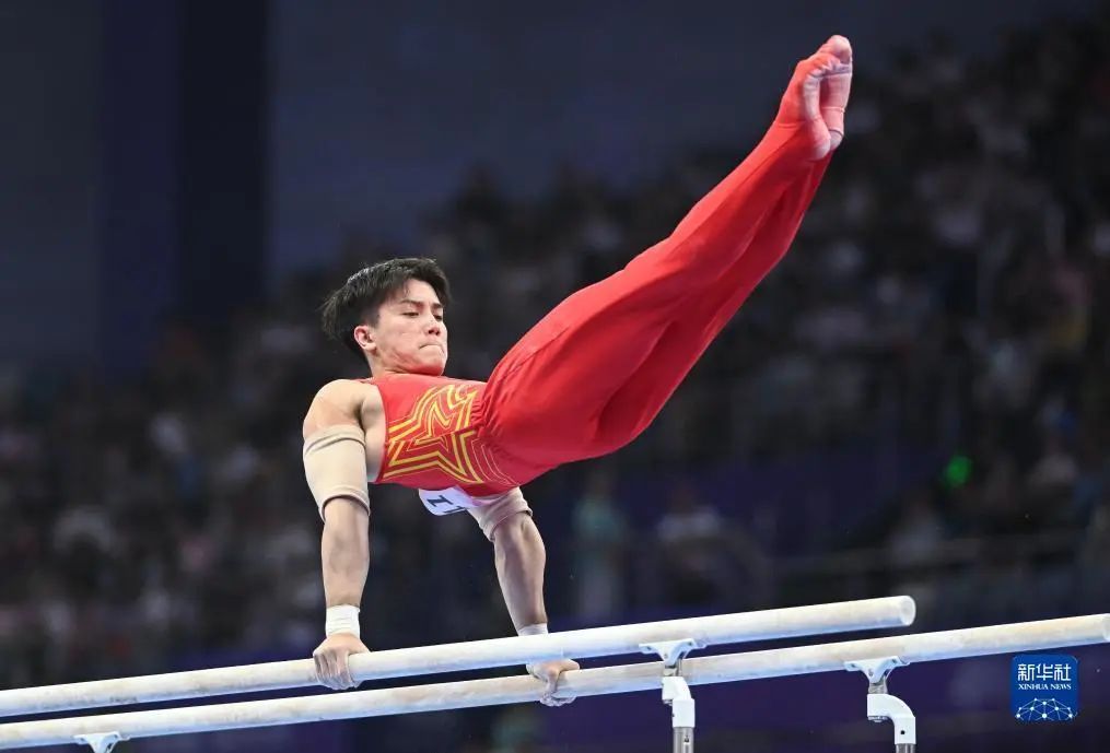 中国队选手林超攀在双杠项目比赛中
