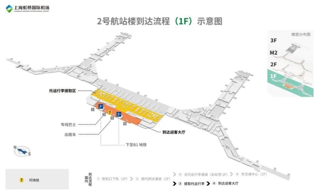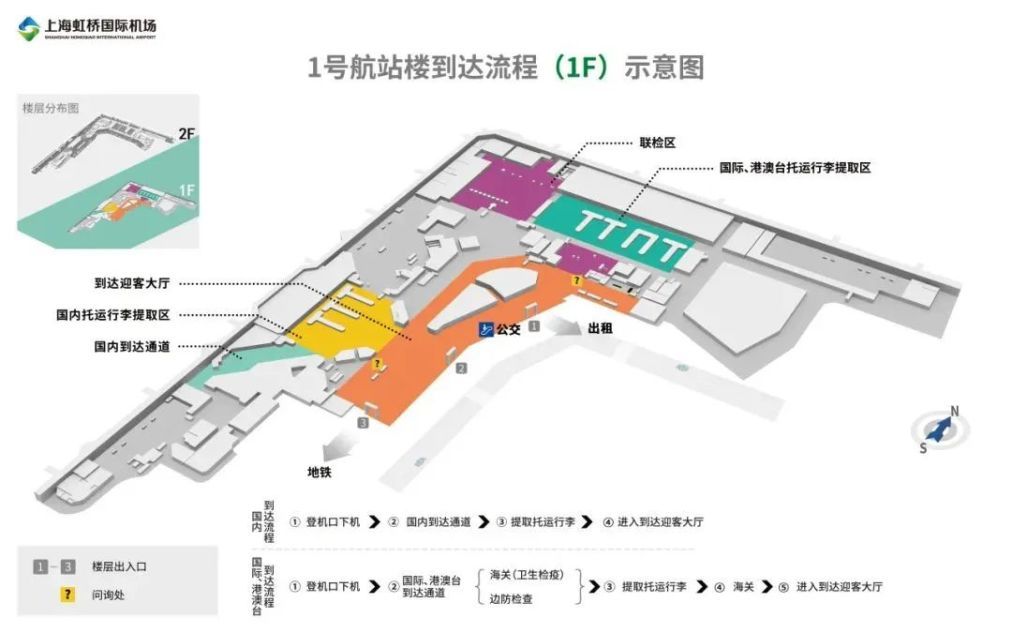 虹桥国际机场2号航站楼到达层共有2个出口,分别是:1F到达层、2F彩虹桥(无托运行李通道)。