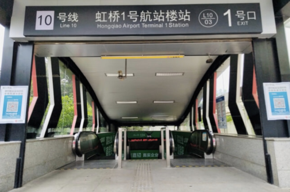 可由T1航站楼3号门出,沿连廊步行约5分钟,即可到达轨道交通10号线——虹桥1号航站楼站1号口。