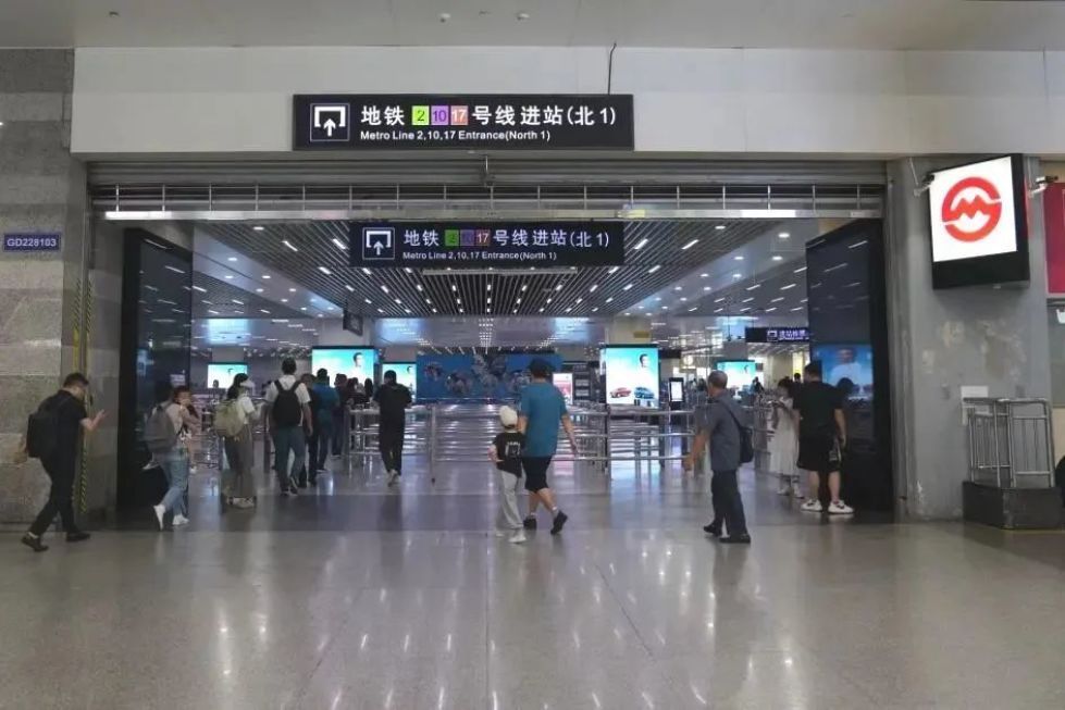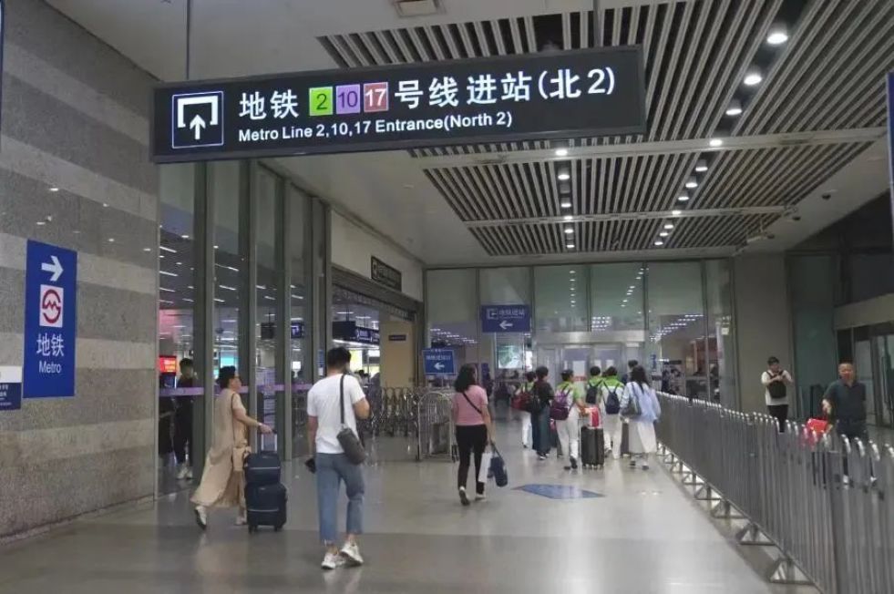 从南出站口1、北出站口1出来的旅客,可选择在虹桥火车站站乘坐轨道交通2号线、10号线、17号线,或选择在虹桥2号航站楼站乘坐轨道交通2号线、10号线;