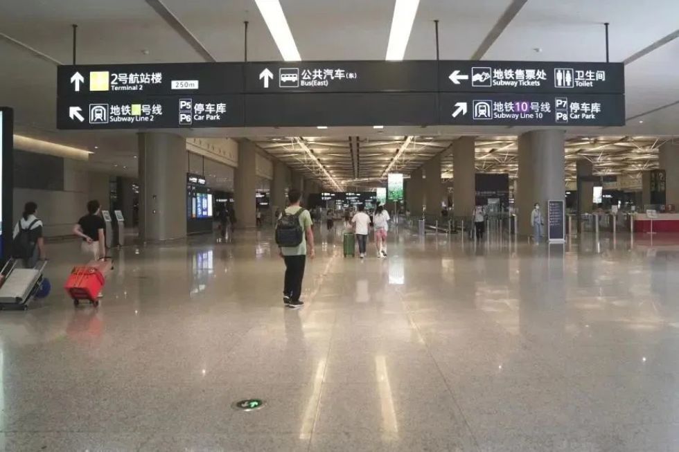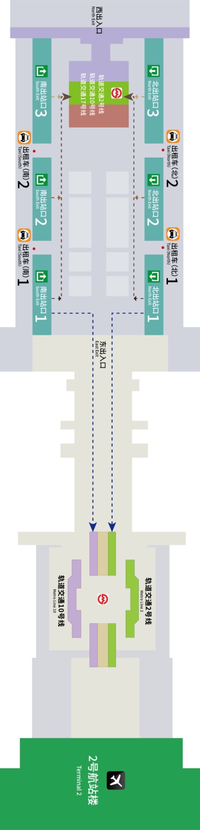 从南出站口1、北出站口1出来的旅客,可自西向东走,前往2号航站楼方向↑