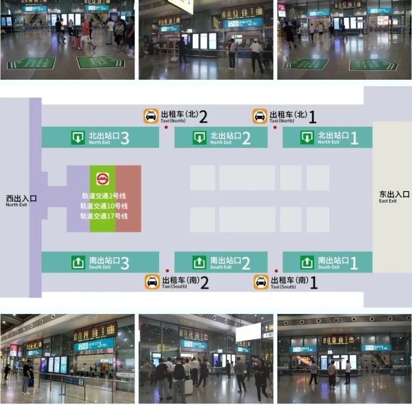 从南出站口2、南出站口3、北出站口2、北出站口3出来的旅客,可选择在虹桥火车站站乘坐轨道交通2号线、10号线、17号线。