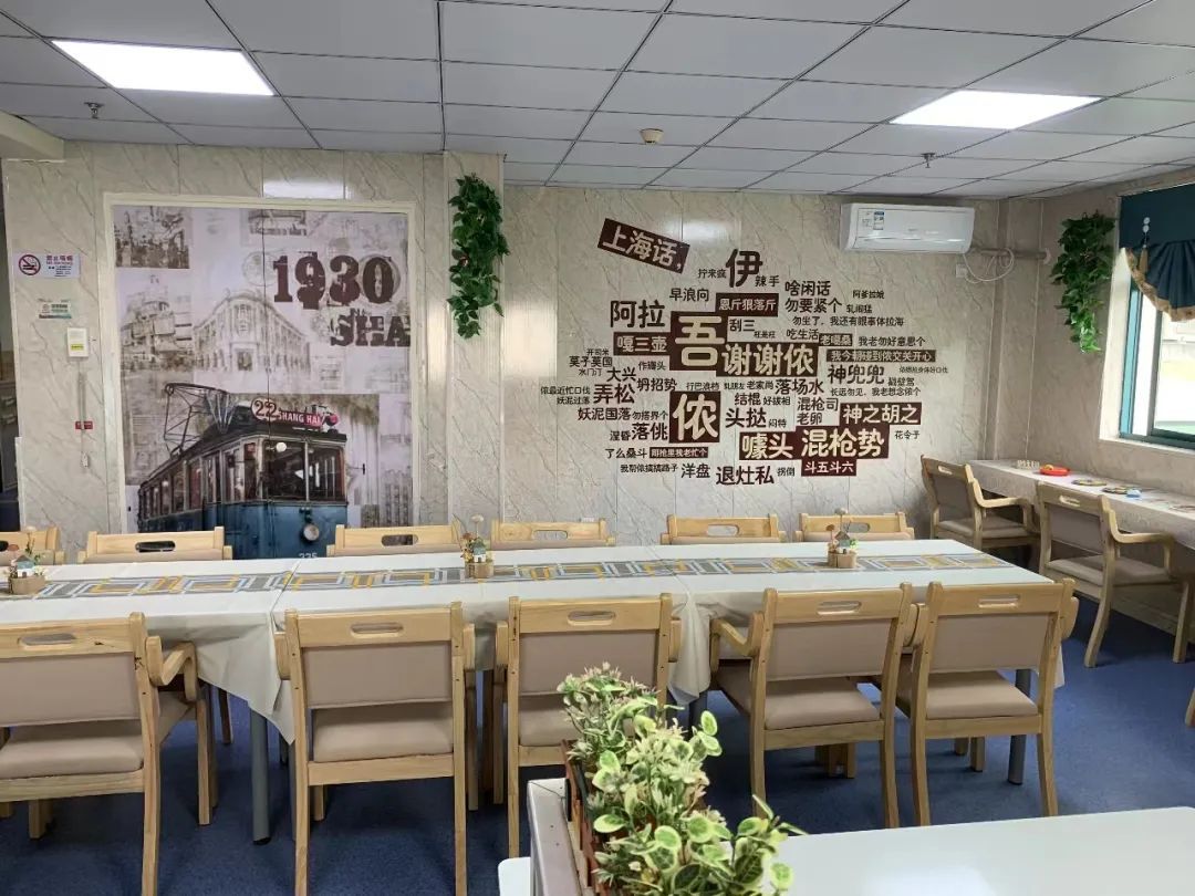 这片区域位于平阳敬老院四楼,围绕2个照护单元、33张床位,以老年人记忆中的老上海、日常生活场景为背景,融入认知干预元素,让老年人在熟悉和充满乐趣的环境中生活。