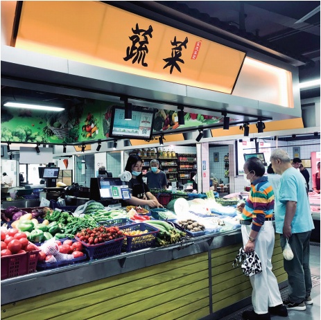 如今的江南菜场约有1000平方米面积,设摊位65个。肉类柜台以醒目简约的木制样式改变了以往的模样;蔬菜柜岛台式的阶梯设计,利于菜品的陈列摆放。