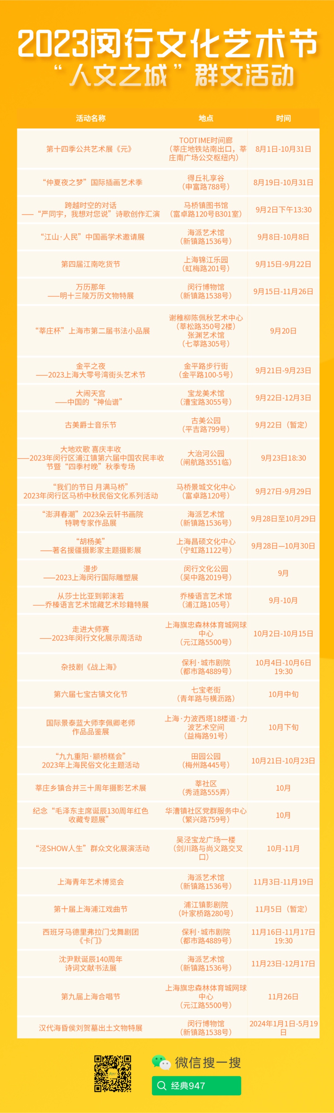 在展览现场,观众们不仅能够沉浸式地了解中国民族乐器的“吹、拉、弹、打”四种演奏方式,更能通过“鉴物”“观影”“赏乐”三个板块的展示,深入地了解到乐器自身的形态特征和音乐风格,感受到乐器制作技艺的源远流长。在“鉴物”板块,观众们可以看到各式各样的民族乐器,包括琵琶、古筝、二胡等等,这些乐器不仅形态各异,而且制作技艺精湛,历史悠久。在“观影”板块,观众们可以通过观看影像资料,了解到敦煌琵琶与乐舞的历史背景,更好地理解乐器背后所蕴含的文化内涵。在“赏乐”板块,观众们可以近身欣赏中国民族乐器的演奏过程,感受到这些乐器所散发出的独特魅力。上海音乐学院民族音乐系学生们现场演奏了笛子、箫、古琴、琵琶、中阮、古筝、二胡、堂鼓等中国传统乐器,这些乐器的演奏为我们展现了国乐的魅力。观众们不仅能够欣赏到中国传统音乐的优美旋律,更能够感受到乐器的历史底蕴和文化内涵。这正是“音乐可展览”的魅力所在。此后几月,在海派艺术馆还将举行美育讲座、庭院音乐会、五感工作坊II、二十四节气视听音乐会、新年音乐会等活动,而在闵行文化公园还将有新·秋兴八景 Citywalk活动,期待与市民们一起在闵行遇见文化艺术。来闵行,与经典艺术来个约会,与美好生活撞个满怀,一起解锁人文密码,品味藏在闵行都市里的诗和远方。2023闵行文化艺术节系列活动一览