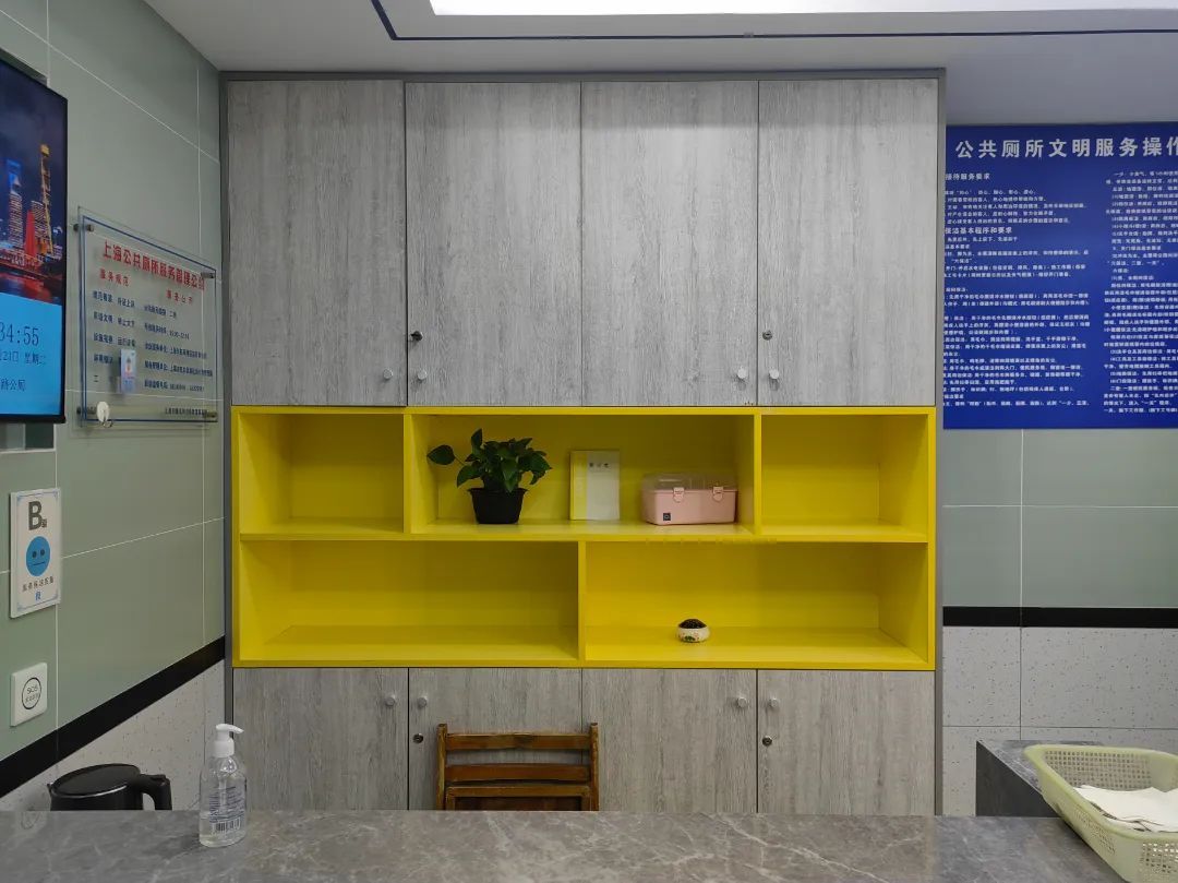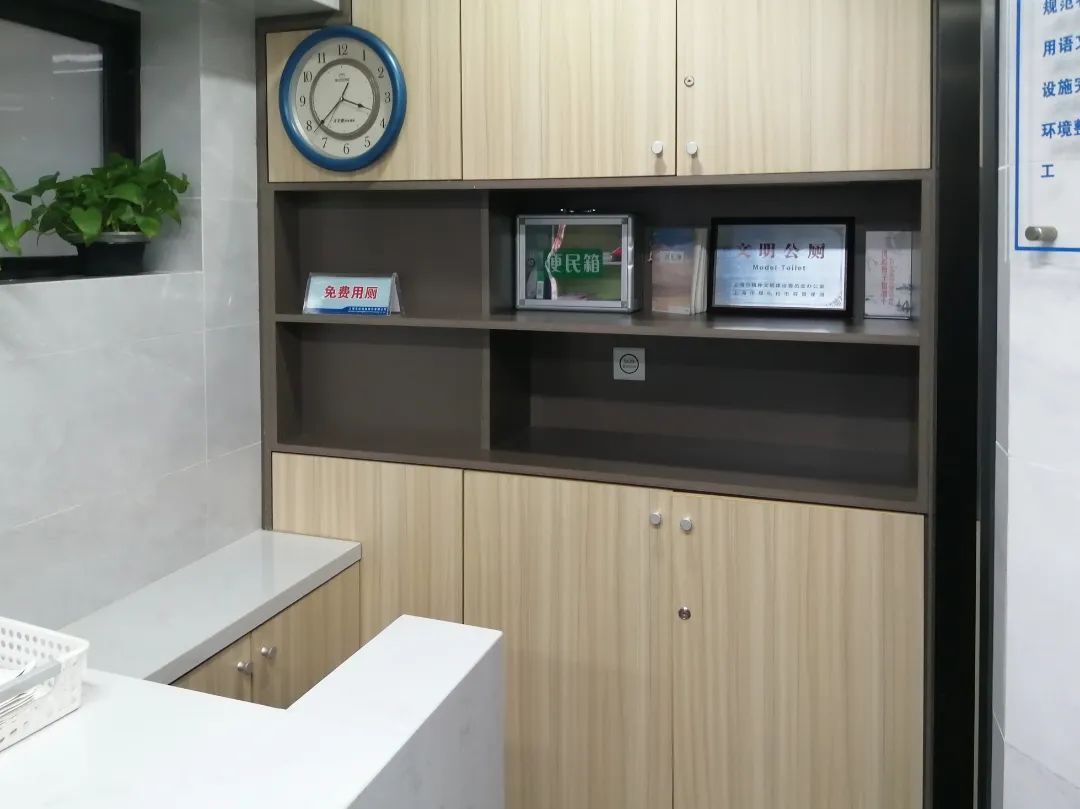 公厕保洁职工工间休息室配置座椅、热水壶、充电设备、储物柜等设施设备,提供新风(含空调)、播放轻音乐等提升功能的设施设备,营造舒适温馨的工作环境。