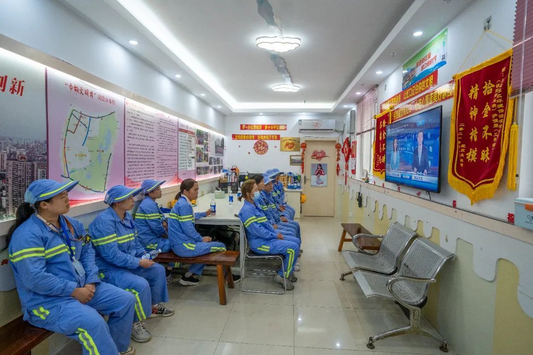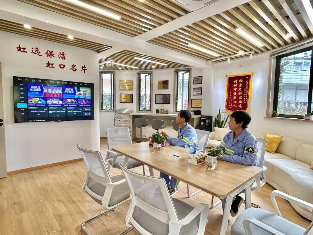 上午9点多,记者来到位于东宝兴路403号的环卫职工工间休息室,走上二楼,映入眼帘的是一个温馨舒适的休息区,几名环卫工人正在这里边看电视边闲聊。