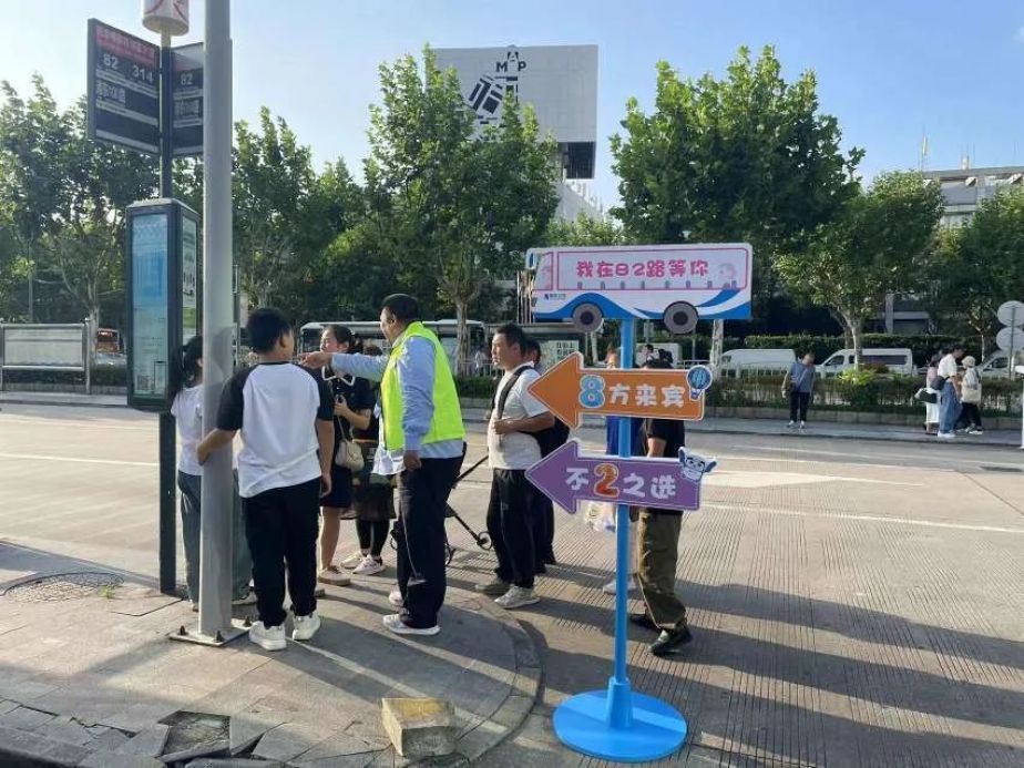 同时为进一步提升陆家嘴全国青年文明号82路志愿者服务岗的服务质量,展现服务风采,树立品牌形象,中秋国庆期间,每天安排2名青蜂志愿者,在陆家嘴滨江枢纽站放置“我在82路等你”“8方来宾”“不2之选”标语路牌,让更多的游客在这个国庆带着国旗合影,青蜂志愿者也将继续为游客提供摄影服务。