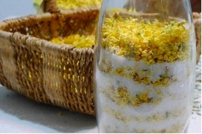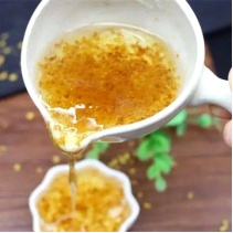 发酵成熟,将桂花捞出来,冲净梅卤、沥干水分,将花倒进白糖,用杵臼捣成黄褐色糖酱,不见花型,只闻其香。