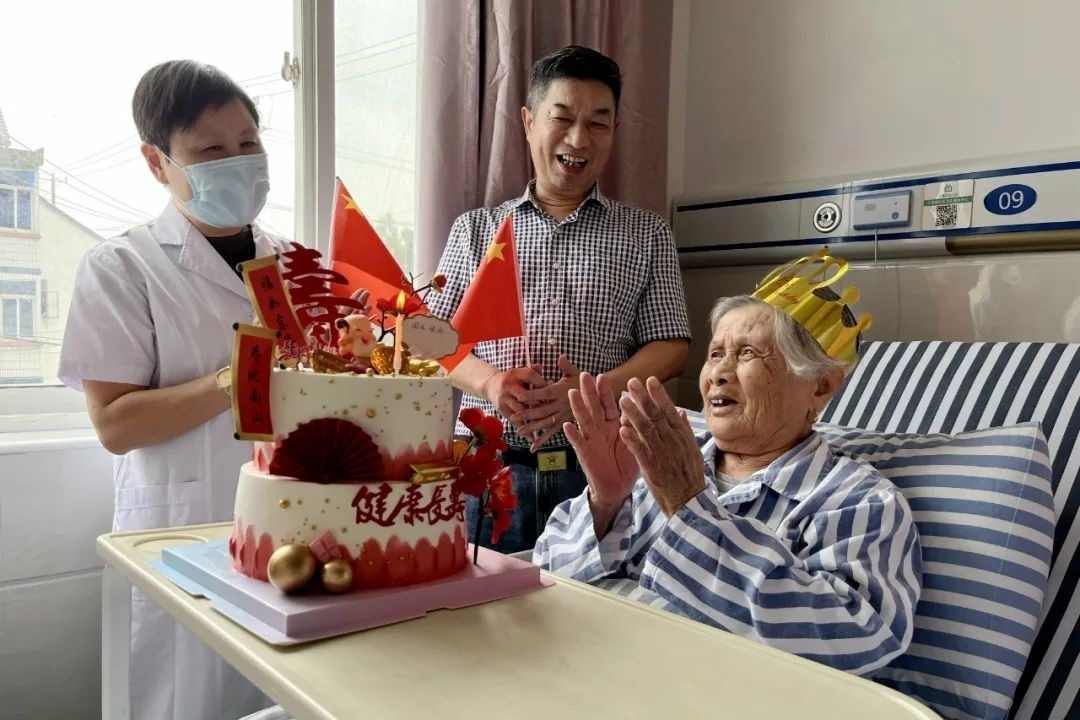 “吴奶奶,生日快乐!”近日,吕巷镇社区卫生服务中心病房内,医护人员捧上精美蛋糕,唱着生日歌,为今年90岁高龄的患者吴奶奶度过了一个特别的生日。 吴奶奶患有高血压、冠状动脉粥样硬化性心脏病等疾病,前段时间,老人阵发性呼吸困难,四肢又持续水肿,没有好转的迹象,家人急忙将老人送到吕巷镇社区卫生服务中心住院治疗,在医护人员的精心治疗和护理下,老人的病情很快得到了控制。 住院期间,护士长肖丹经常到床前看望老人,得知这两天临近吴奶奶90岁的生日,又恰逢假期,医护人员特地为老人送上蛋糕,点燃蜡烛,共同祝福老人身体健康,幸福长寿。 一口蛋糕一声问候,病房满是欢声笑语。“这是我最难忘、最特别的一个生日。”在一声声的生日祝福中,吴奶奶眼角闪动着幸福的泪光,激动地说道:“没想到,今年还能在社区医院过生日。你们想得太周到了,真的谢谢你们!” 值得一提的是,双节期间,吕巷镇社区卫生服务中心还开展了“迎国庆,庆中秋”主题活动,让患者在住院期间也能感受到家的温暖。“谢谢你们,每个节日都不会忘记我们……”患者高兴地拉着医护人员的手连声道谢,脸上绽放着喜悦的笑容,感染着病房内的每个人。 “作为医护人员,我们能做到并且一直在做的,就是做有‘温度’的金山卫健人,营造温馨安全舒适的就医环境,让患者感受到无处不在的关爱和家一样的温暖,构建更加和谐的医护患关系。”吕巷镇社区卫生服务中心主任李新英表示。