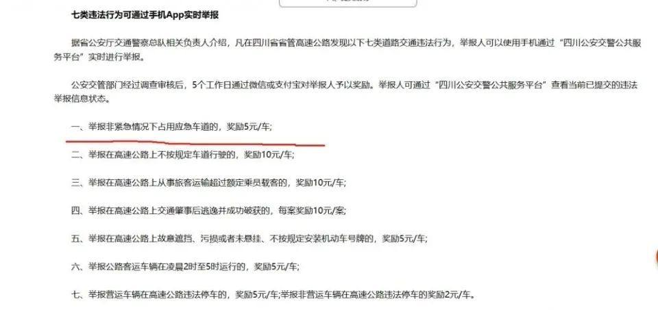 四川高速公路举报占用应急车道有5元奖励