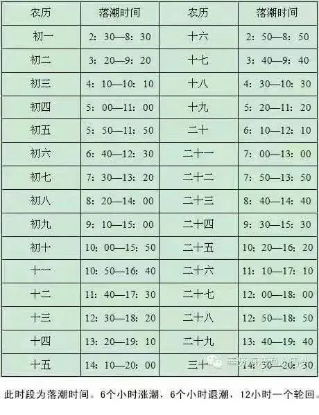 很多人来海边想看看波澜壮阔的海面,可是如果不巧遇上了退潮的时间只能是白跑一趟,因此,这张落潮时间表(仅供参考)可一定要保存起来,能够很大程度的避免白跑路。 注意:此时段为落潮时间,6个小时涨潮,6个小时退潮,12个小时一个轮回。