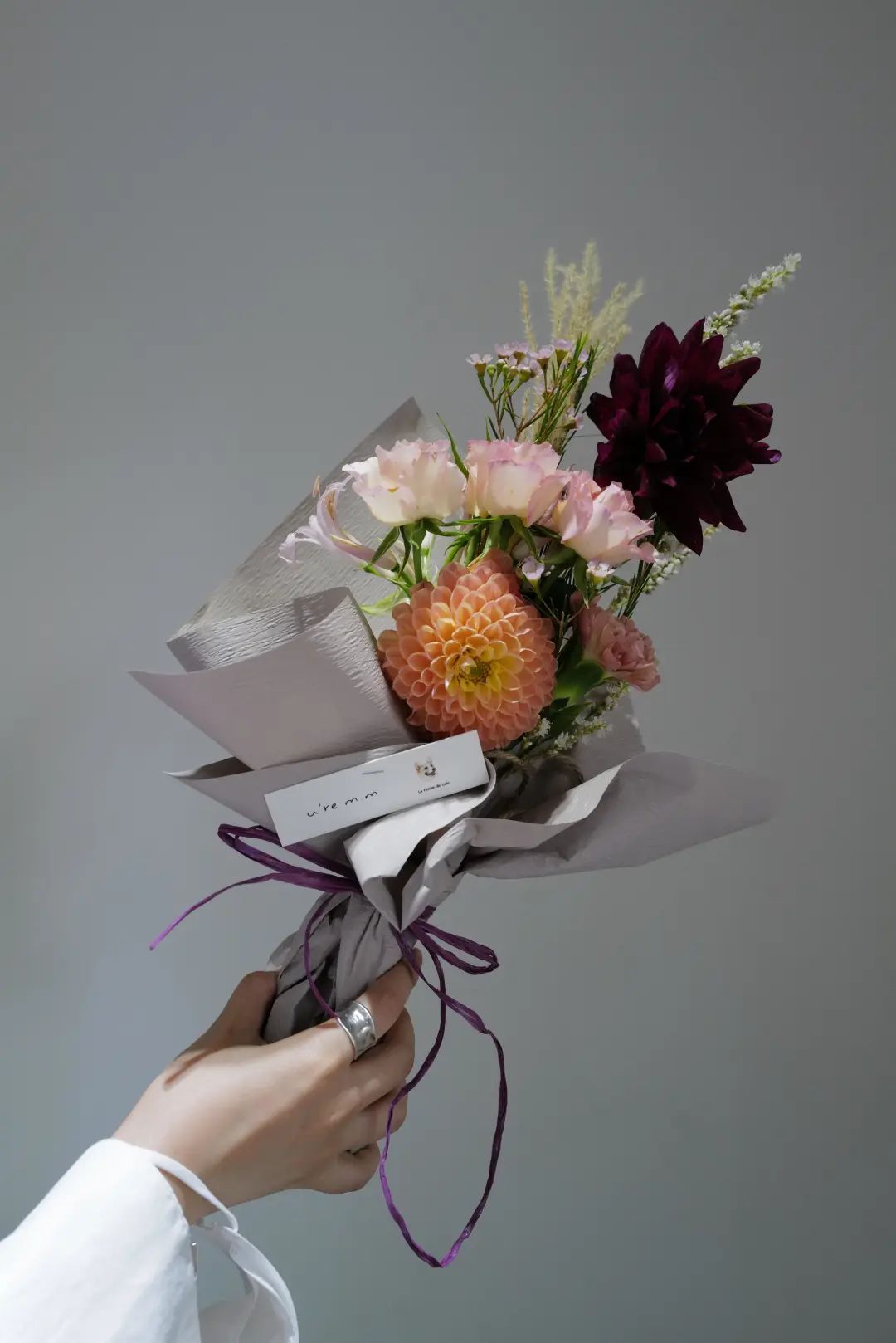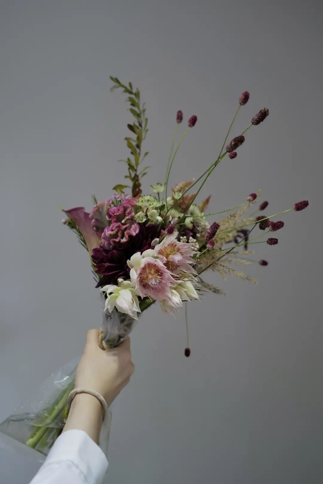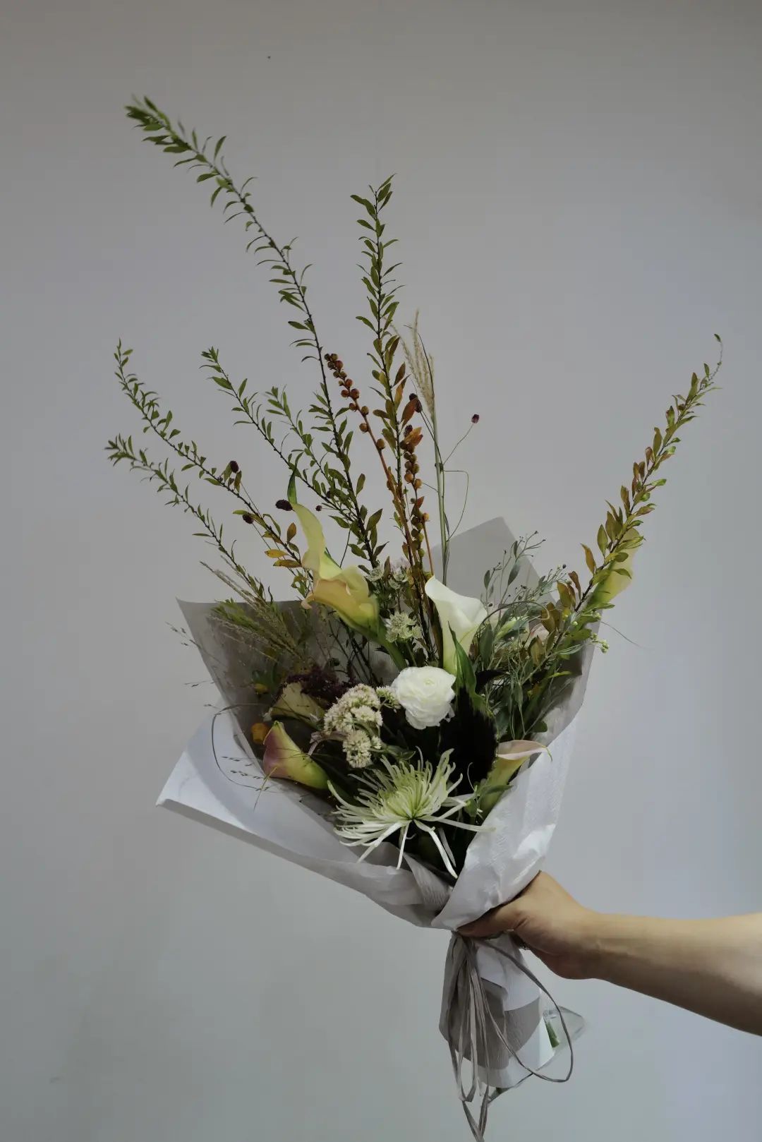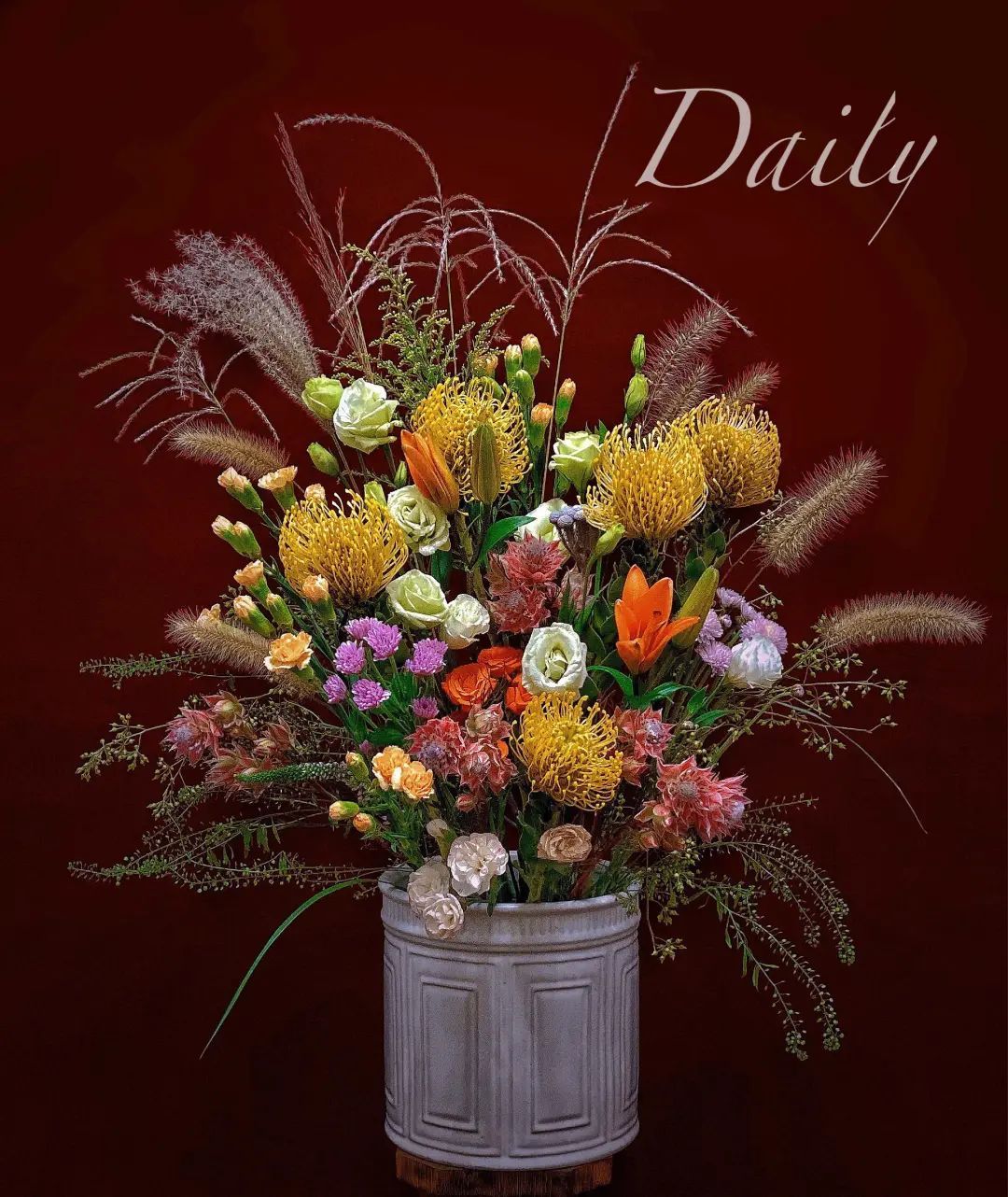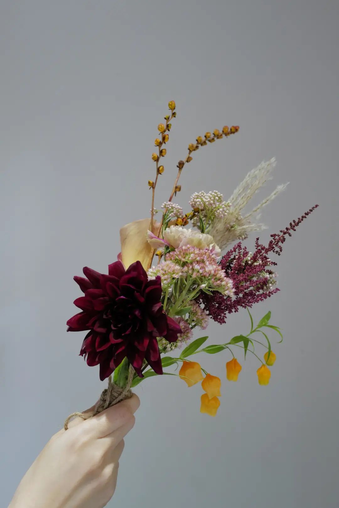 简单来说,在一个花艺作品里,让棕色系的这类颜色占主导,局部辅佐以一些橙红色、橘黄色等亮色,碰撞出低调大气又不失亮点的搭配。