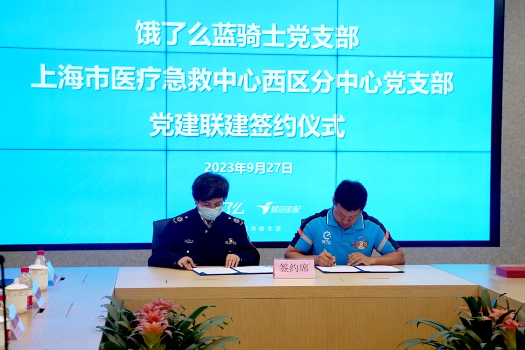近日,饿了么蓝骑士党支部与上海市医疗急救中心西区分中心党支部举行了党建联建签约仪式,双方将联合对蓝骑士进行创伤包扎等急救培训,提升骑手对急救知识的了解。蓝骑士党支部书记周子卿说:“每天有数十万外卖骑手在社区里穿梭,希望经过公众急救培训后,能有越来越多的蓝骑士成为流动救护员。”