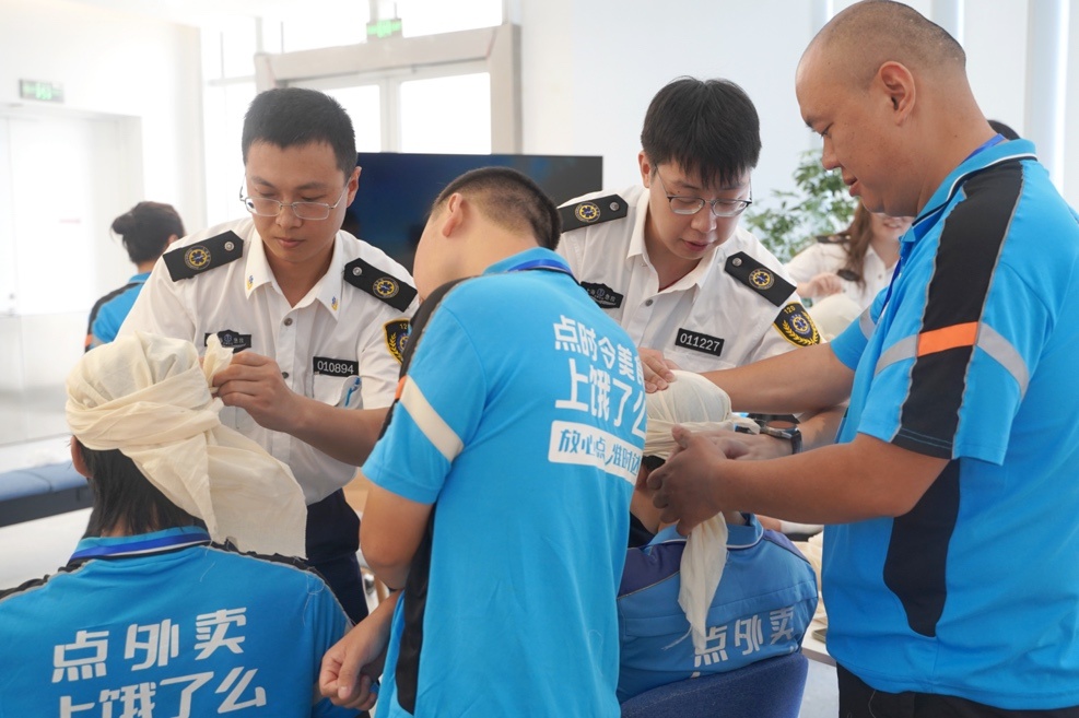 上海医疗急救中心西区分中心的培训导师现场为数十位蓝骑士进行了创伤包扎急救培训。培训导师从外卖骑手较常遇到的交通安全问题着手,深入浅出地讲解了意外事故可能碰到的出血类型、如何正确拨打求助电话等。再通过手把手讲解不同部位创伤适合使用的包扎手法和注意事项后,骑手们结成两两一对,互相进行了实操练习。