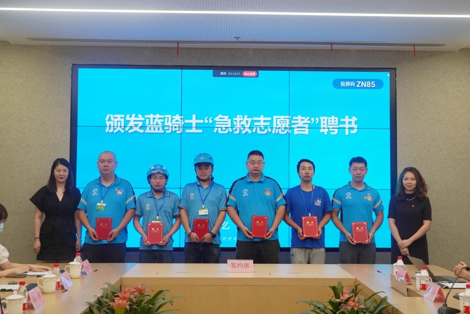当天,六位普陀区蓝骑士收到一份来自饿了么的特别聘书,他们将作为社区急救志愿者代表,在遇到突发状况时为社区居民提供简单的急救帮助。蓝骑士宋增光表示:“很荣幸受聘成为‘急救志愿者’,在做好本职工作外,我们外卖骑手正解锁越来越多的身份,我们也很高兴能够为社区建设出一份力!”
