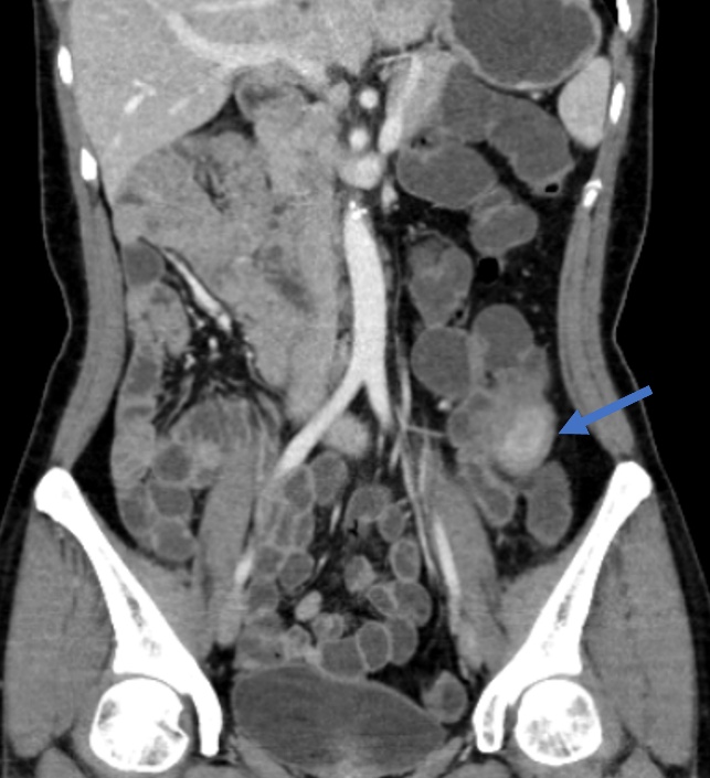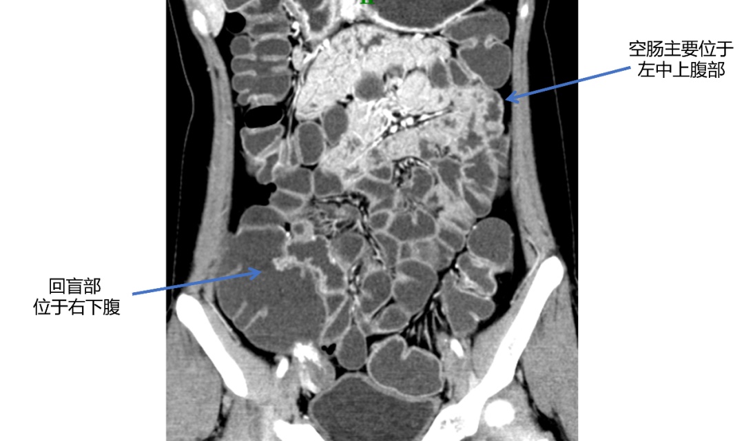 “正常人的空肠主要位于左中上腹(如图1),回盲部位于右下腹,而她的空肠在右上腹,回盲部范围位于左下腹的位置,因此定位及定性诊断应为回盲部的一个炎性肉芽肿(如图2蓝色箭头处)。”赵雪松医生分析道。在放射科“火眼金睛”的探查下,胃肠外科张弢医生结合患者病史和病变位置,做出了手术的决定。几天后的手术中,果然发现了她回盲部的炎性肉芽肿,及时进行了手术,避免了错误的手术定位以及其继续生长可能造成的肠梗阻等问题。术后一周不到,刘女士便顺利出院了,回归正常饮食状态的她感到无比庆幸,她笑着说“还是瑞金医院的平台强大!在多学科的合作努力下,成功帮我找到了隐藏多年的病因……”