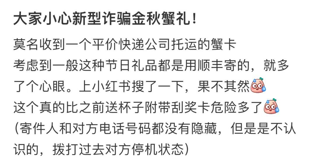 近日,市民周女士收到不明快递,拨打快递单上的电话却无人接听。打开快递,里面是一张大闸蟹兑换卡和一封自称某购物平台的信。
