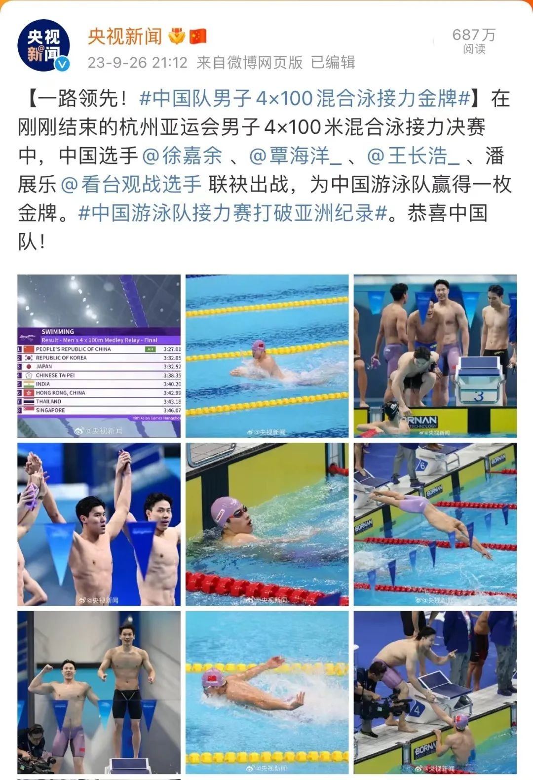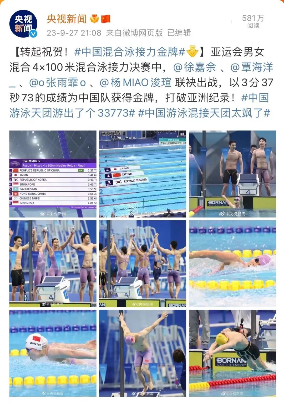 据悉,本次MVP的评选标准是根据运动员在杭州亚运会的表现,其中就包括获得的奖牌数,以及打破的纪录情况。