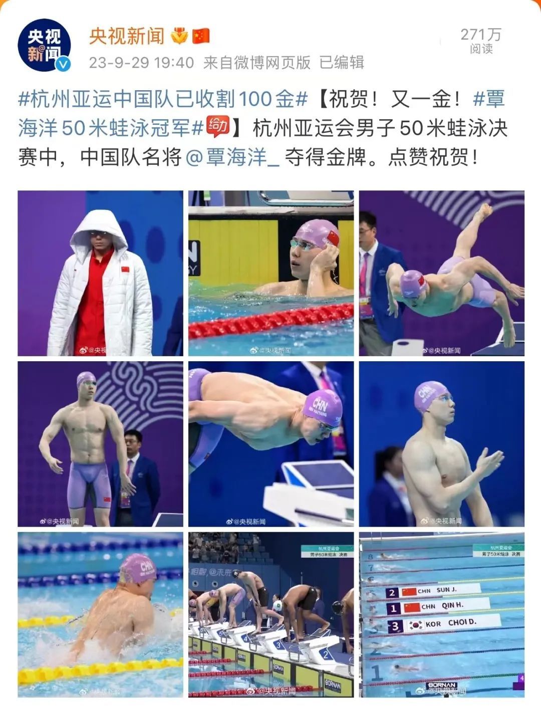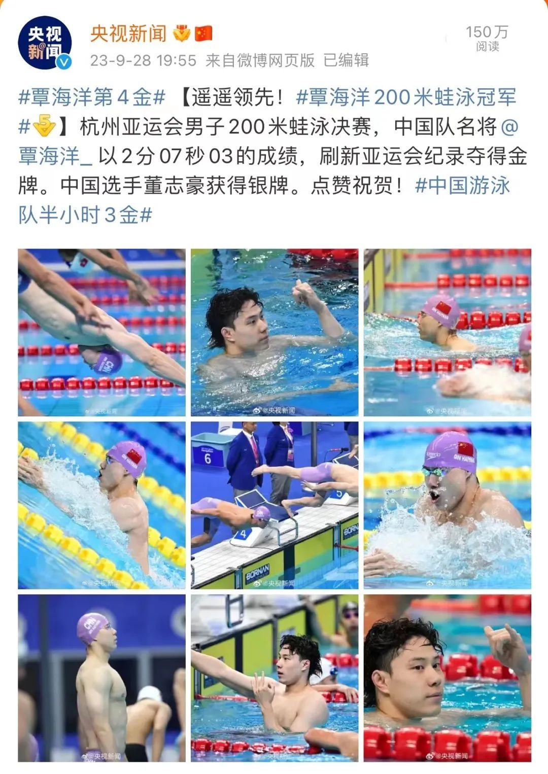 覃海洋强势包揽了男子100米、男子200米、男子50米三个蛙泳项目的金牌,并拿下男子4x100米混合泳和男女混合4x100米混合泳的接力冠军,他还在男子200米个人混合泳中获得一枚银牌。覃海洋的亚运之旅再次火力全开,不仅为中国代表团拿下亚运会第100枚金牌,还多次打破赛会纪录,创造新的亚洲纪录。