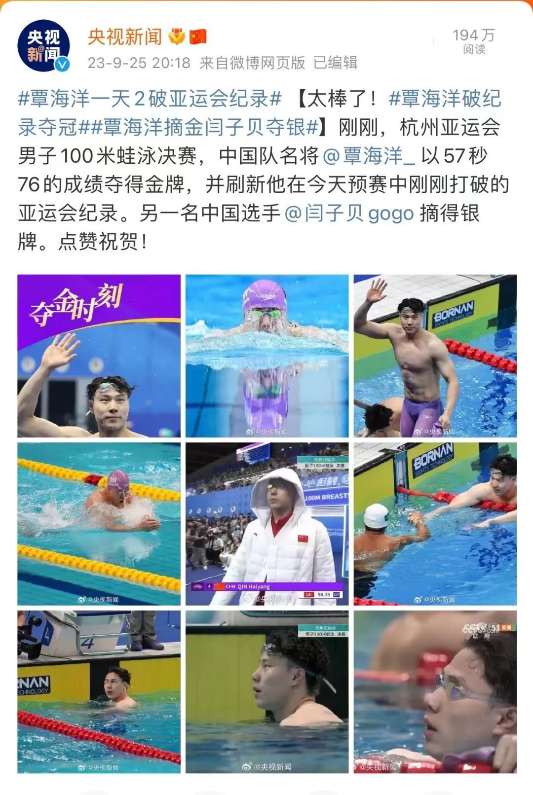 张雨霏、覃海洋获此殊荣