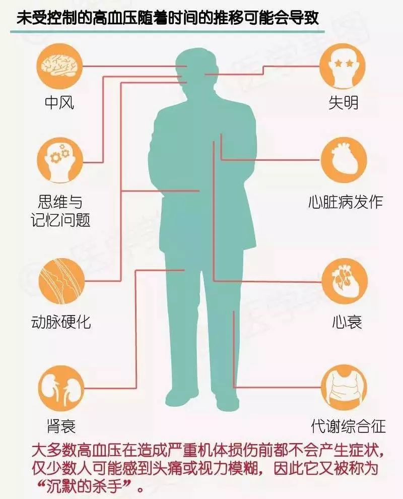 高血压被称为“无声的杀手”,很多患者在发病前没有明显的症状,如果血压长时间维持在较高水平,会对心、脑、肾等靶器官造成严重危害,导致脑血管病(包括脑出血、脑梗死、短暂性脑缺血发作)、冠心病、心力衰竭、主动脉夹层、慢性肾衰等不可逆的并发症。