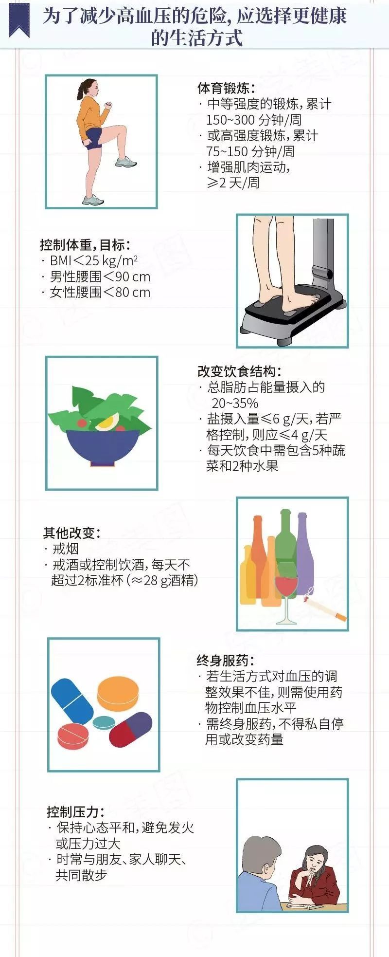 血压达标标准:一般高血压患者,血压降至140/90mmHg以下,合并糖尿病、冠心病、心力衰竭或慢性肾脏疾病伴有蛋白尿的患者,血压应控制在130/80mmHg以下;年龄在65-79岁的患者血压降至140/90mmHg以下,如能耐受,可进一步降至130/80mmHg以下;80岁及以上老年患者可控制至140/90mmHg以下。