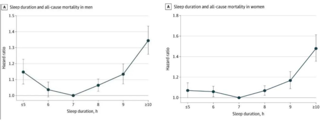2021年发表在《美国医学会杂志》网络期刊上的研究发现,睡眠时长与全因死亡率之间呈现“J型关联”——7小时的睡眠时间是与全因、心血管疾病和其他原因死亡相关的最低点;持续的睡眠不足和持续的睡眠过多都会导致死亡率升高。