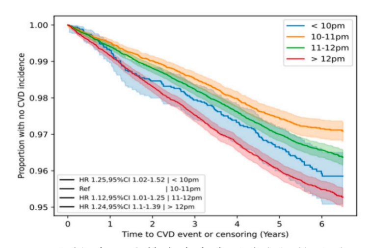具体来看,与10:00—10:59入睡相比,晚上11:00—11:59入睡的人患心血管疾病的风险高12%,在午夜或更晚入睡的人高25%,而晚上10:00之前入睡的人高24%。