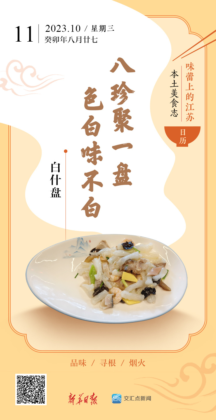 白什盘,顾名思义是一盘不用任何调色手法炒制出的什锦菜,是苏帮菜中的一道名菜。将虾仁、鸡片、蹄筋、木耳、香菇、笋片、鱼片、鱼肚等多种原料混炒,讲究白汤白炒、原汁原味,没有香浓的调料,没有刺激的辛辣,口味清鲜平和,体现了江苏烹饪注重食材本味的传统。
