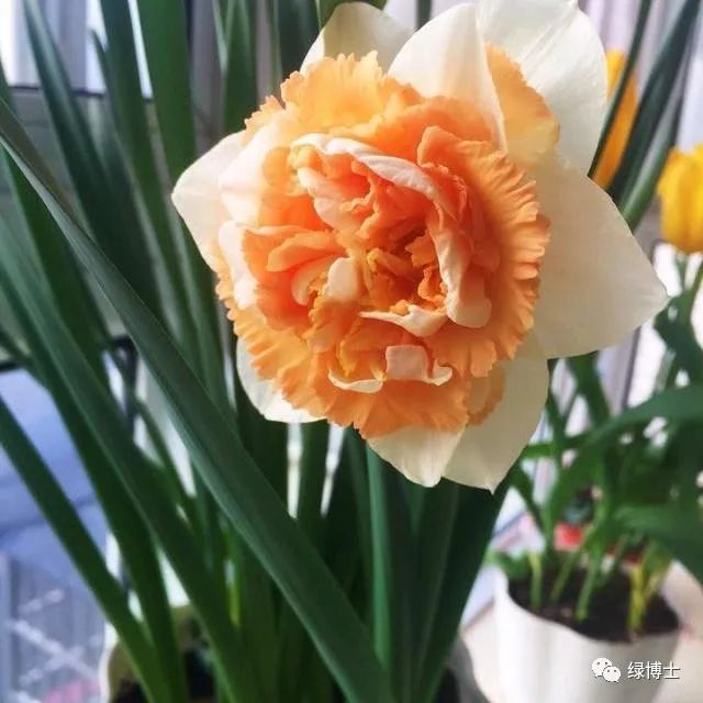 洋水仙是石蒜科水仙属植物,鳞茎卵圆形,常单个或2个基部相连;鳞茎外膜色浅而薄。洋水仙的叶片呈宽线形,叶色绿中带蓝灰,给人以优雅端庄的感觉。和我们春节时的中国水仙不同,洋水仙不仅株型和花朵较大,而且花朵的副花冠的花色和形状多变。