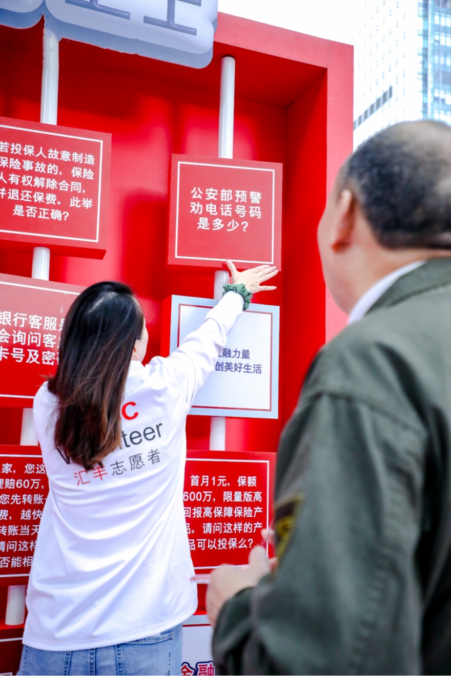 “上面哪些情况是有可能产生风险的?”“汇眼识局”摊位前,工作人员向参加活动的大家提问道。面对主持人的问题,参与的群众需要在列出的银行知识防范问题提示词中选择出正确答案。不仅如此,在摊位旁的电话亭内,面对电话亭中模拟诈骗人员的来电,参与者们需要随机应变、化险为夷。