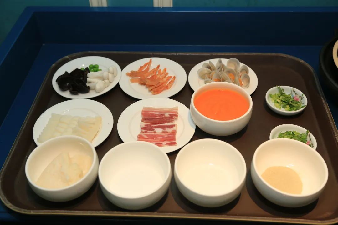 主料:高汤1000毫升、手工老豆腐(台州手工豆腐)250克、蛤蜊100克、虾干50克、笋片100克、咸五花肉50克、青豆30克、白玉菇50克、黑木耳50克、小葱末10克、香菜末10克、姜5片、葱5段