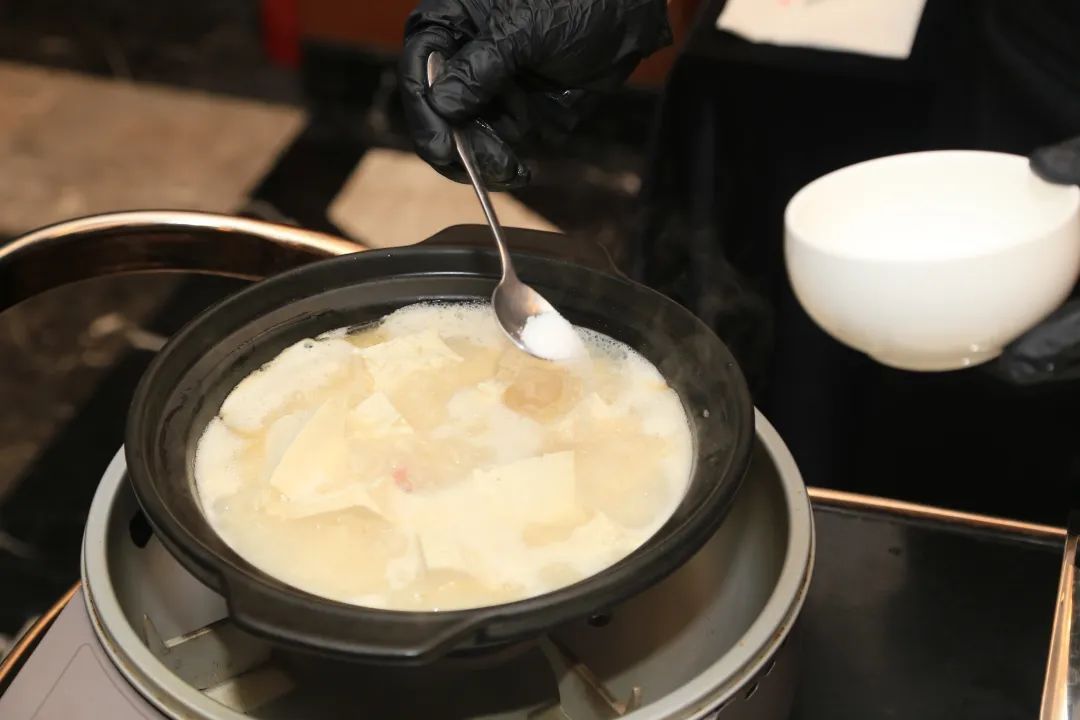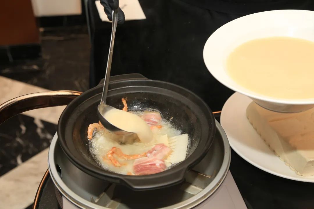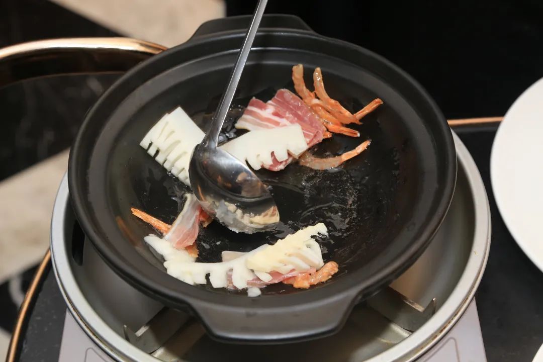 步骤二:热锅下入半勺猪油,加入咸肉片、虾干煸香,加入一汤匙黄酒,依次加入蛤蜊、豆腐(手撕大块)、笋干、青豆、2片姜、高汤。