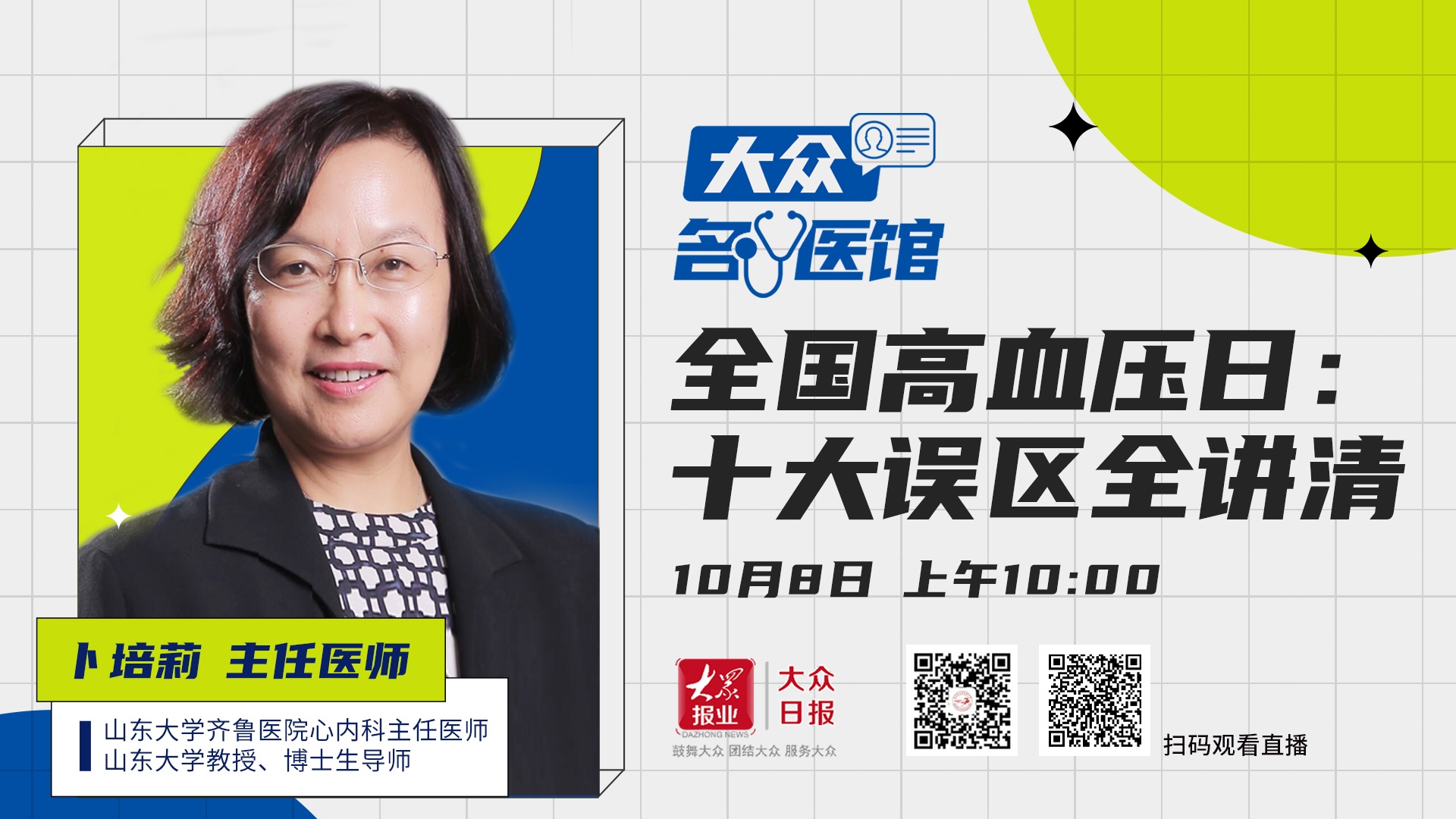 恰逢第26个全国高血压日,为“健康生活,理想血压”,山东大学齐鲁医院心内科主任医师、山东大学教授、博士生导师,内科教研室副主任卜培莉做客《大众名医馆》,科普讲解高血压认识的“十大误区”,快来科学认识一下吧!
