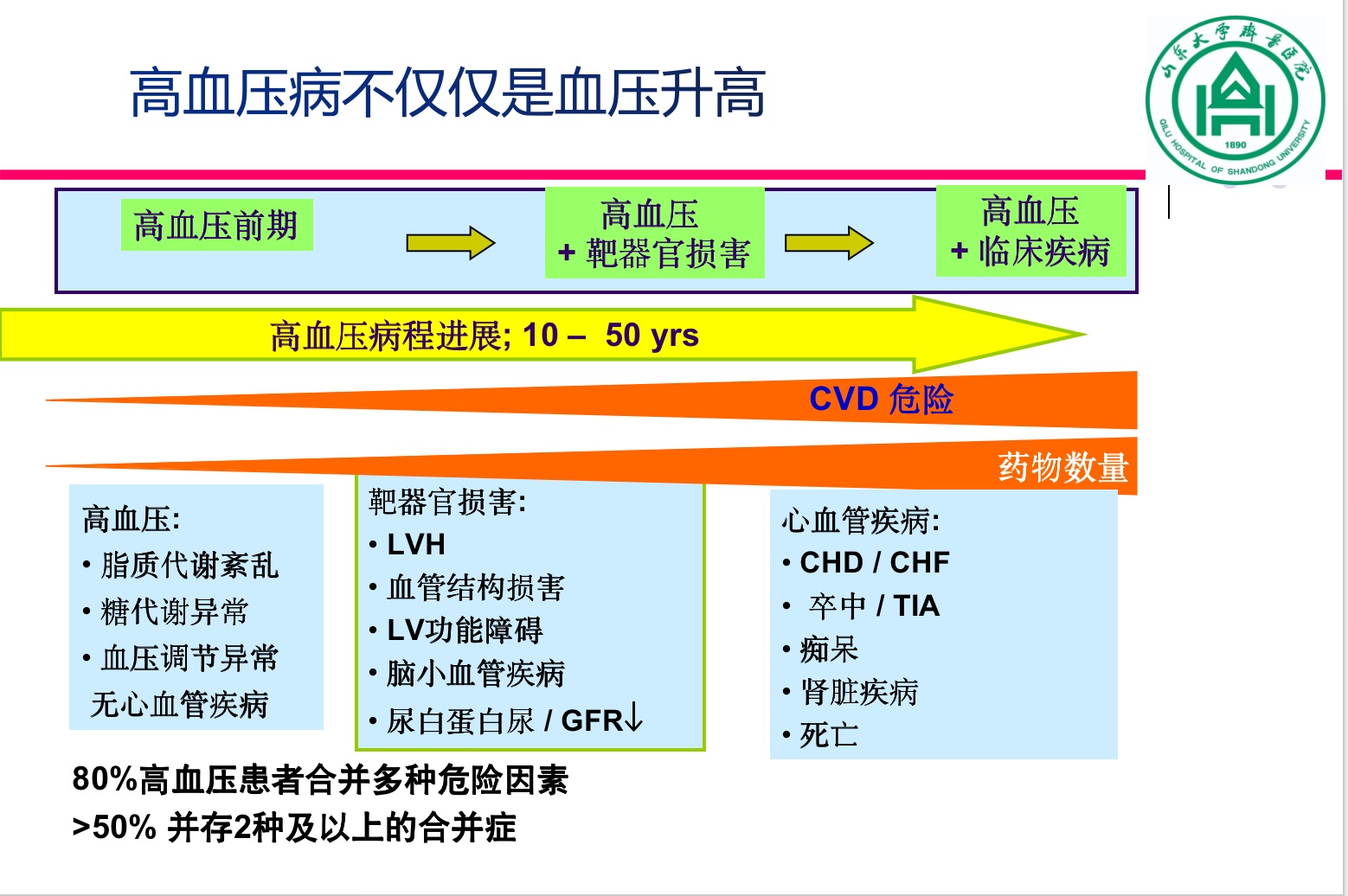 卜培莉:其实血压高并不可怕,可怕的是高血压的并发症。高血压会引起心脏受损、脑血管受损、肾脏受损、眼睛受损等疾病。高血压前期,伴随血压升高,患者会出现脂质代谢紊乱、糖代谢异常、血压调节异常、无心血管疾病。随着病情发展,会导致靶器官损害,引起血管结构损害、脑小血管疾病、尿白蛋白尿/GFR(肾小球滤过率)增高等。严重者可引发心脑血管疾病,例如冠心病、心力衰竭、卒中、痴呆、肾脏疾病甚至死亡。高血压患者中,80%会合并多种危险因素,大于50%的患者会并存2种及以上的合并症。