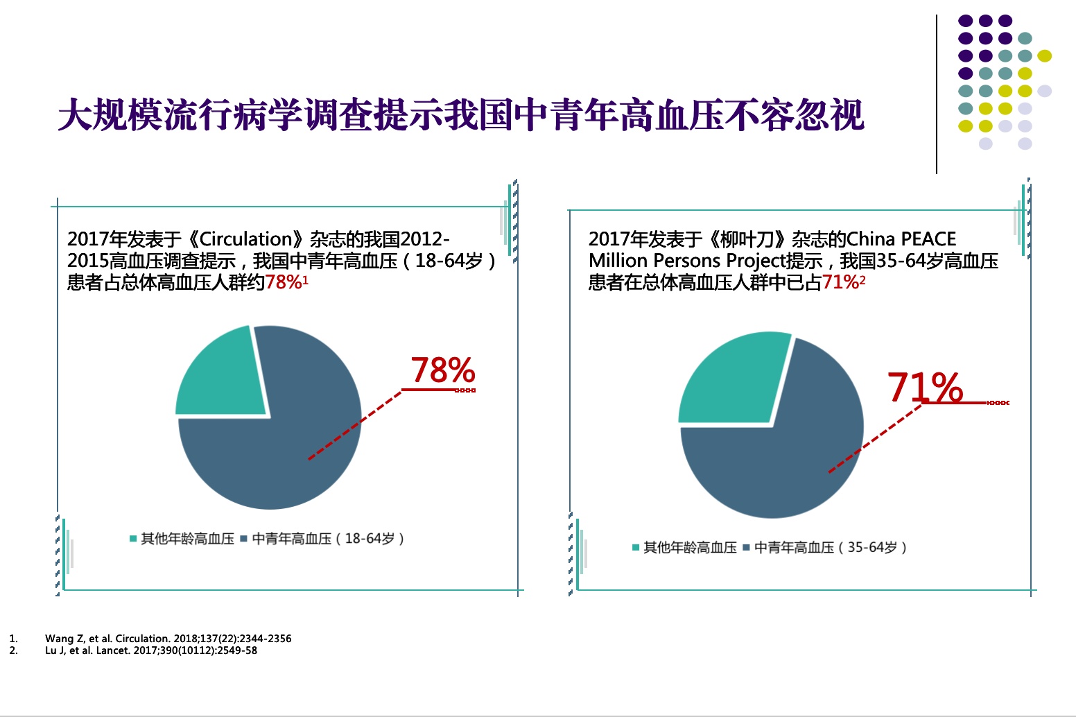 卜培莉:其实不然,近年来中青年(年龄18岁~64岁)高血压增长很快,占比已达到78%,是我们要特别关注的重点。中青年高血压具有独特的临床特征,多为轻度高血压、缺乏典型症状,所以家庭自测血压比例较低;常见舒张压升高、超重肥胖和代谢异常者比例高,所以具有低依从性和血压控制率。