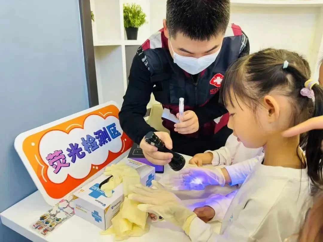 “洗手荧光检测”小实验,则是通过以荧光粉模拟微生物的方式告诉小朋友,细菌虽然看不见,但是它无处不在,养成良好的洗手习惯,是阻断细菌和病毒传播最有效、最简单的方法之一。