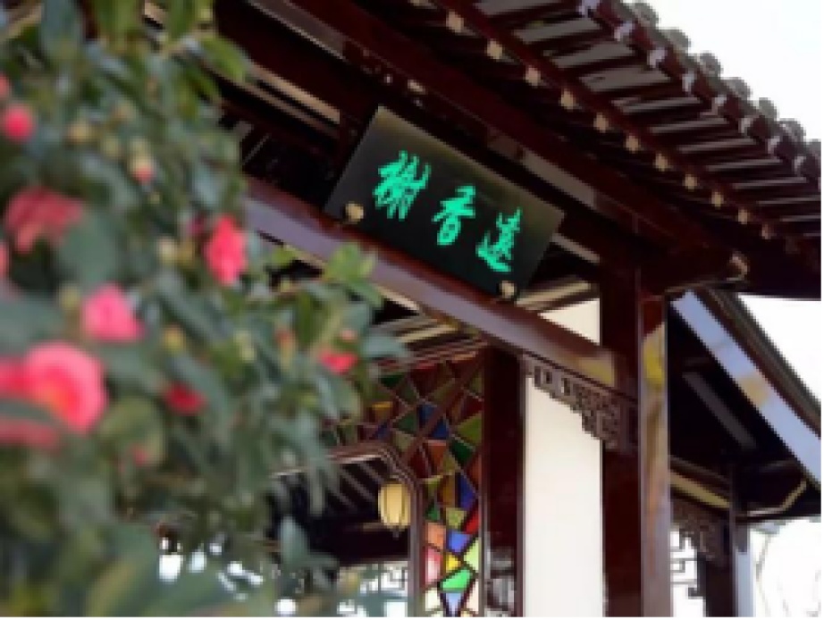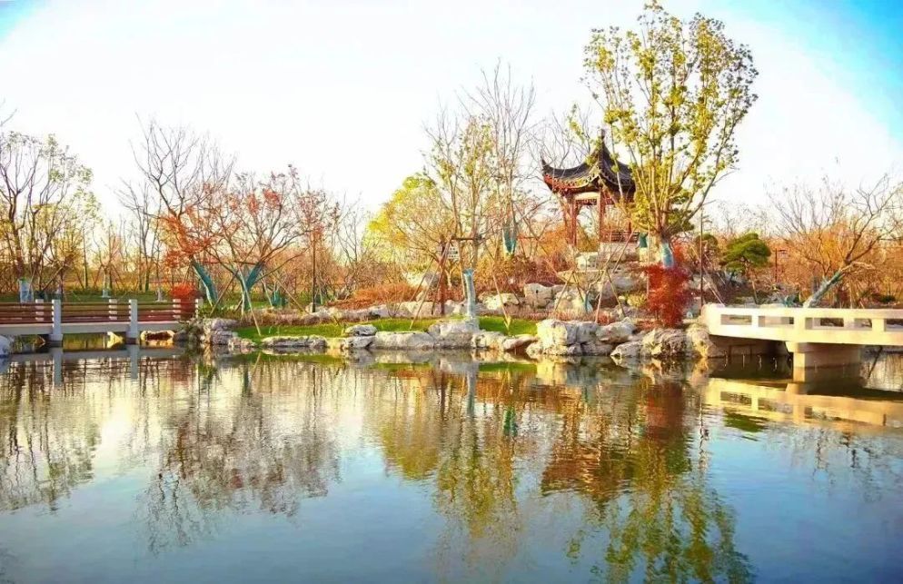 其中,湖心岛的“海棠春归”是独具特色的江南自然风景园,运用“借、放、障”的造景手法,将小岛与公园环境相融合,展现古今交融的古镇民居风貌。