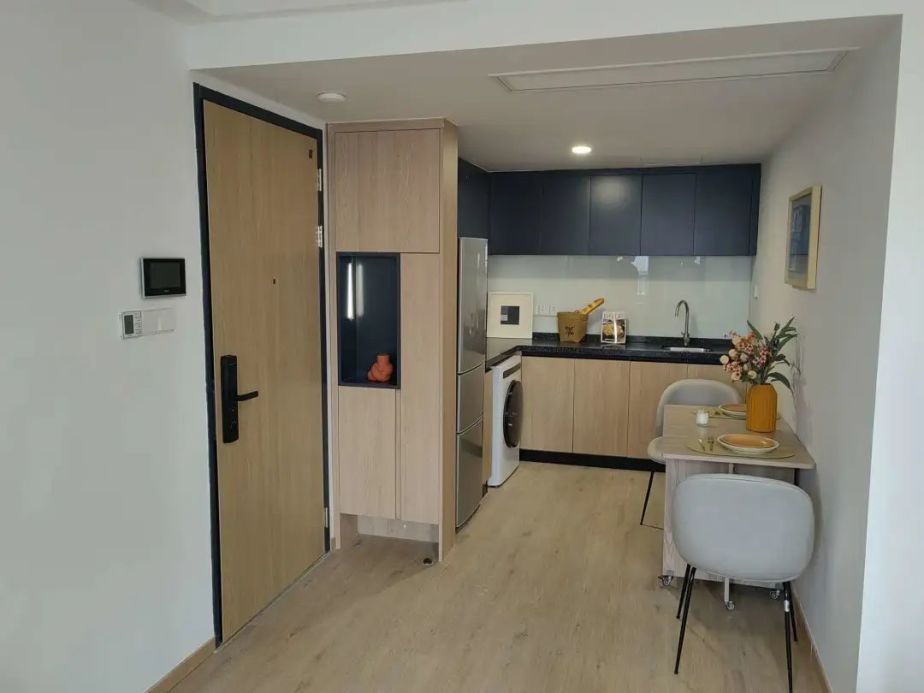 房间内,家具、空调、带烘干的洗衣机,电冰箱等设施一应俱全。同时,社区内涵盖约9000平方米的生活配套和商业功能,包括社区食堂、洗衣房、共享厨房、健身房、理发室等公共空间,可充分满足社区居民生活、休闲、运动、娱乐、办公等多样化居住需求,为租住者创造更加丰富、更为便捷的品质生活体验,不仅吸引了很多年轻人的目光,也受到不少企业的关注。据了解,目前,包括中国商飞、吉祥航空等企业客户已经入住。