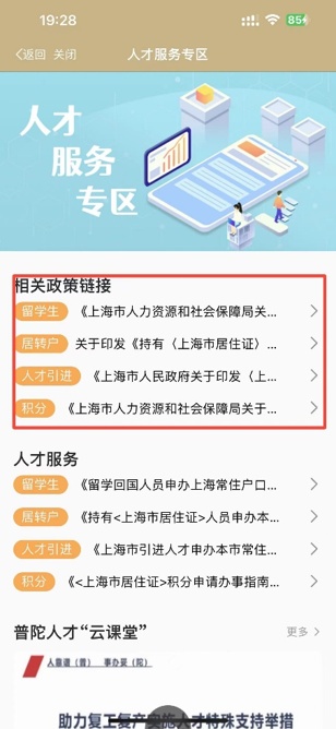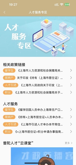 人才服务专区包含“相关政策链接”“人才服务”“普陀人才‘云课堂’”“人才项目”“人才活动” 共计5项功能,下面让我们逐一为这些服务做个介绍。